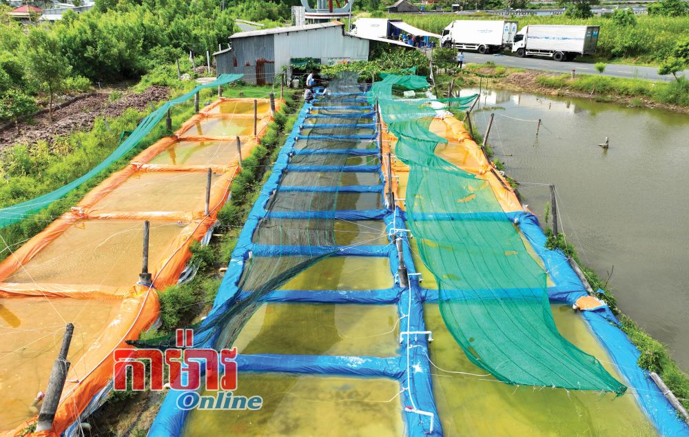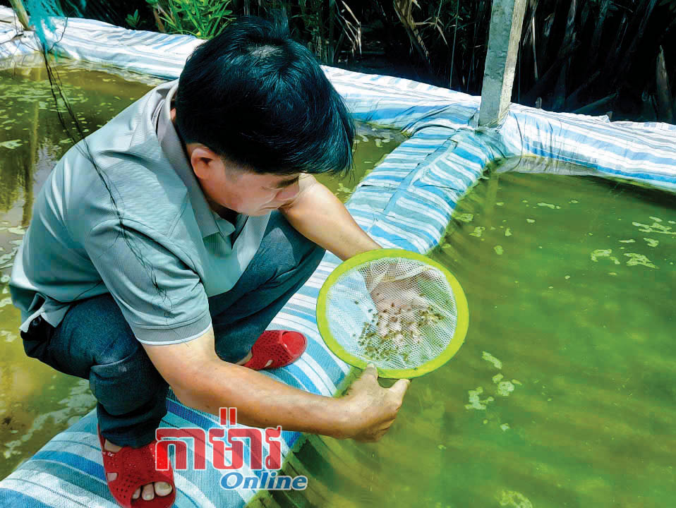 លោក Đoàn Văn Tiến ពីនិត្យក្តាមពូជក្នុងអាងបង្កាត់ពូជរបស់ខ្លួន។