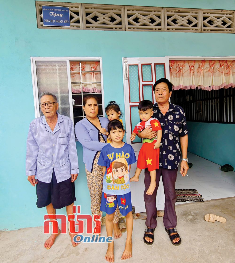 លោក Nguyễn Văn Nguyên (ស្តាំ) រួមជាមួយគ្រួសារនៅក្បែរផ្ទះមហាសាមគ្គីដែលបានគណៈកម្មាធិការរណសិរ្សមាតុភូមិសង្កាត់ Hiệp Thành និងរដ្ឋអំណាចភូមិភាគឧបត្ថម្ភ។