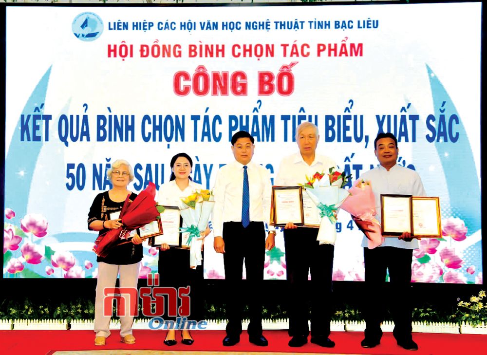 លោក Thạchn Đờ Ni ប្រធានសាខាសមាគម (ខាងស្តាំ) ទទួលវណ្ណកម្មឆ្នើម ក្នុងរយៈពេល ៥០ ឆ្នាំ ក្រោយថ្ងៃឯកភាពប្រទេសជាតិ ដែលបានជ្រើសរើសដោយសម្ព័ន្ធភាពសមាគមអក្សរសិល្ប៍ ខេត្ត Bạc Liêu ។