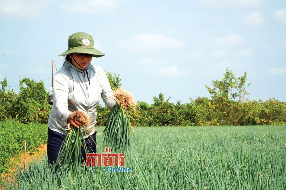 ចំការខ្ទឹមស្លឹកលូតលាស់បៃតងស្រស់របស់អ្នកមីង Lâm Thị Hà។